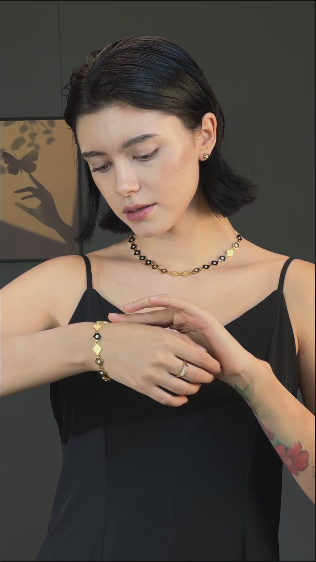 The “Hexagonal Harmony Set” reflects a balance between bold geometry and delicate elegance. This matching set of a choker, bracelet, and stud earrings features a series of interconnected hexagonal links, alternating between smooth golden finishes and moissanite accents. The design celebrates strength, unity, and brilliance, embodying the modern woman’s multifaceted personality. Each piece is lightweight, making it perfect for all-day wear without compromising on luxury and sophistication.