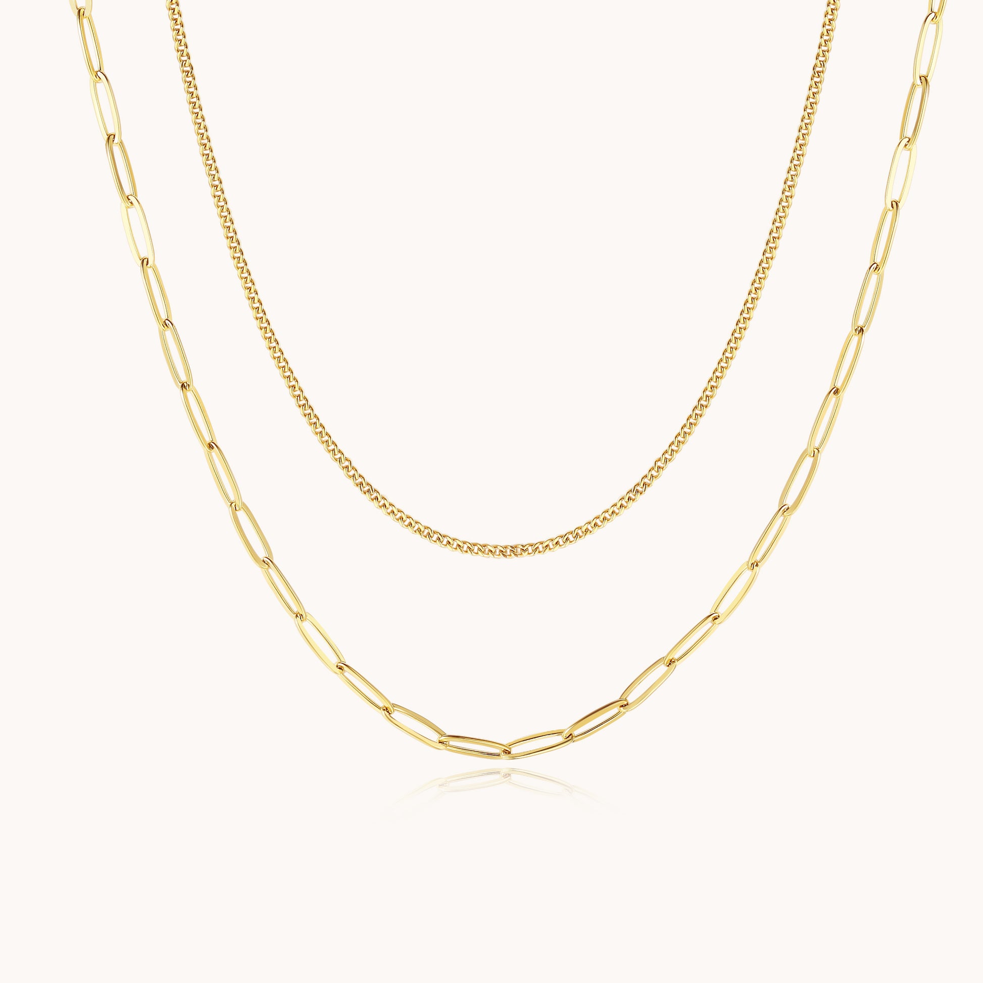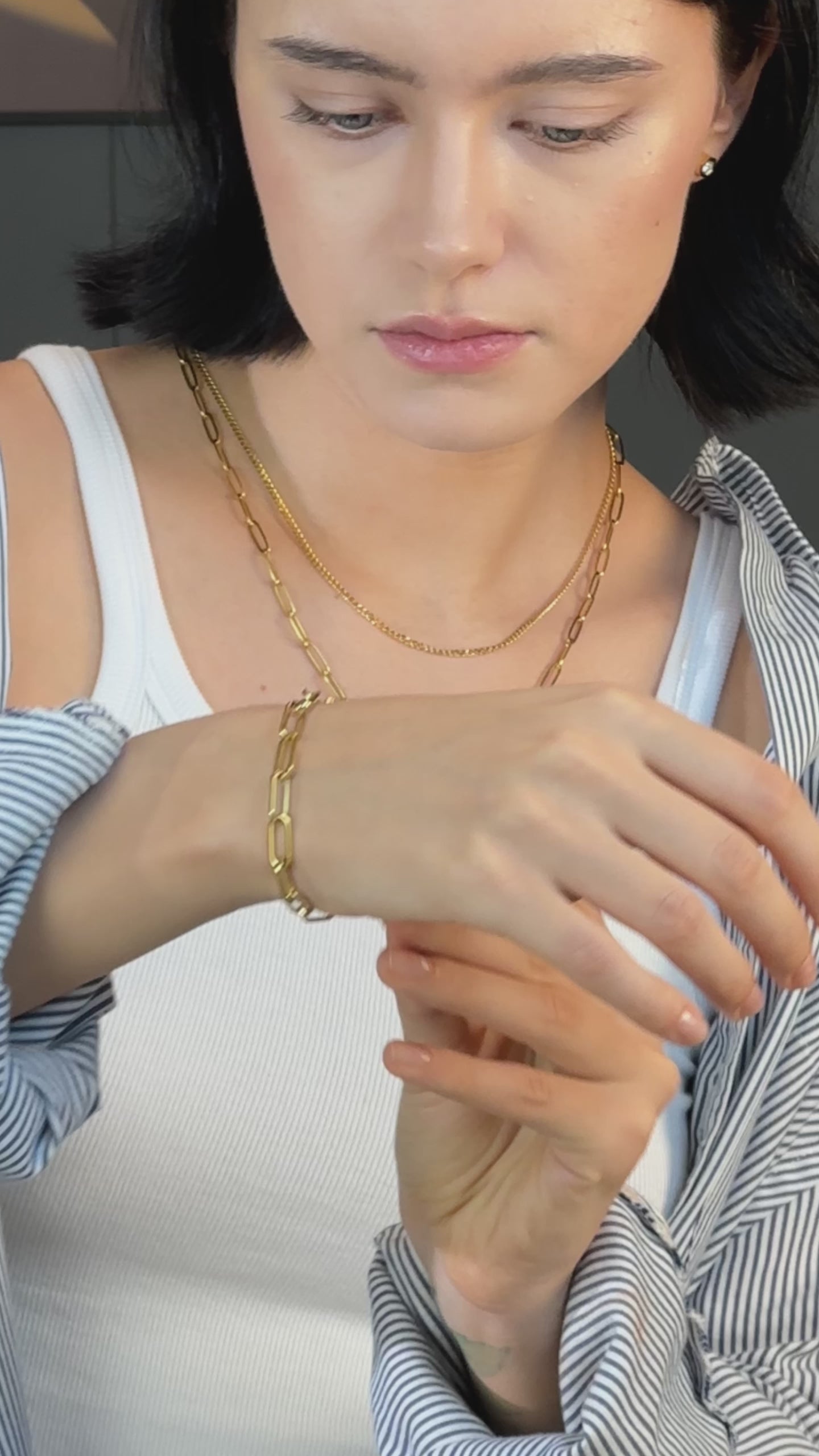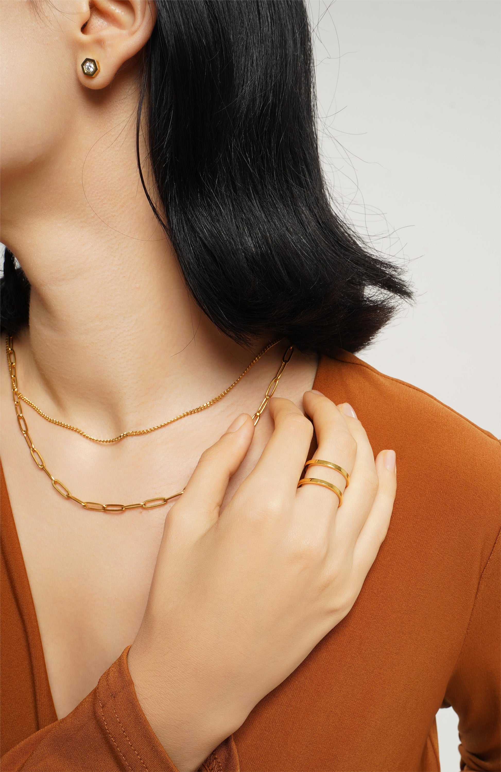 The “Golden Harmony Layered Necklace” features a sophisticated two-layer design that combines a flat snake chain and a bold elongated link chain. The necklace exudes modern elegance, perfect for any occasion. The smooth, polished gold finish adds a timeless touch to this versatile piece, making it easy to pair with any outfit, from casual to formal.